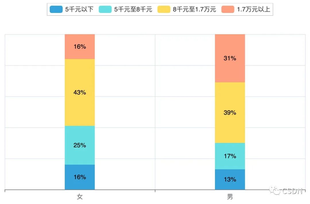 在男多女少的开发者圈中,双方薪资也存在一定差异。在月薪超过 1.7 万元的区间中,男性开发者的占比为 31%,女性开发者仅有 16% 。不过在 8 千元到 1.7 万元区间中,女性开发者的占比(43%)略高于男性开发者(39%)。
