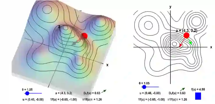 其中, 为 与 的夹角,显然,当 即 与梯度 同向时,方向导数取得最大值,最大值为梯度的模 当 即 与梯度 反向时,方向导数取得最小值,最小值为梯度模的相反数。此外 根据上面方向导数的公式可知,在夹角 时方向导数为正,表示 方向函数值上升, 时方向导数为负, 表示该方向函数值下降。