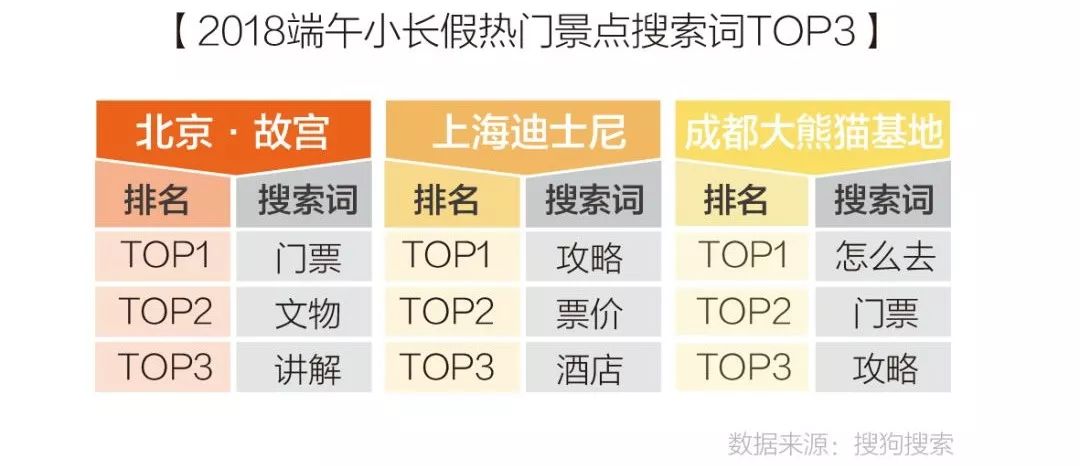 北京故宫、上海迪士尼和成都大熊猫基地是3城居民周边游的热门目的地。搜狗搜索的关键词数据也体现出,计划前往这3处景点的游客都关心什么: