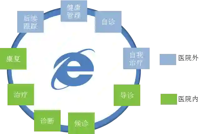 • 从就医价值链的角度来看,互联网医疗是互联网从健康管理、自诊、诊断、治疗、用药到康复的全链条结合。