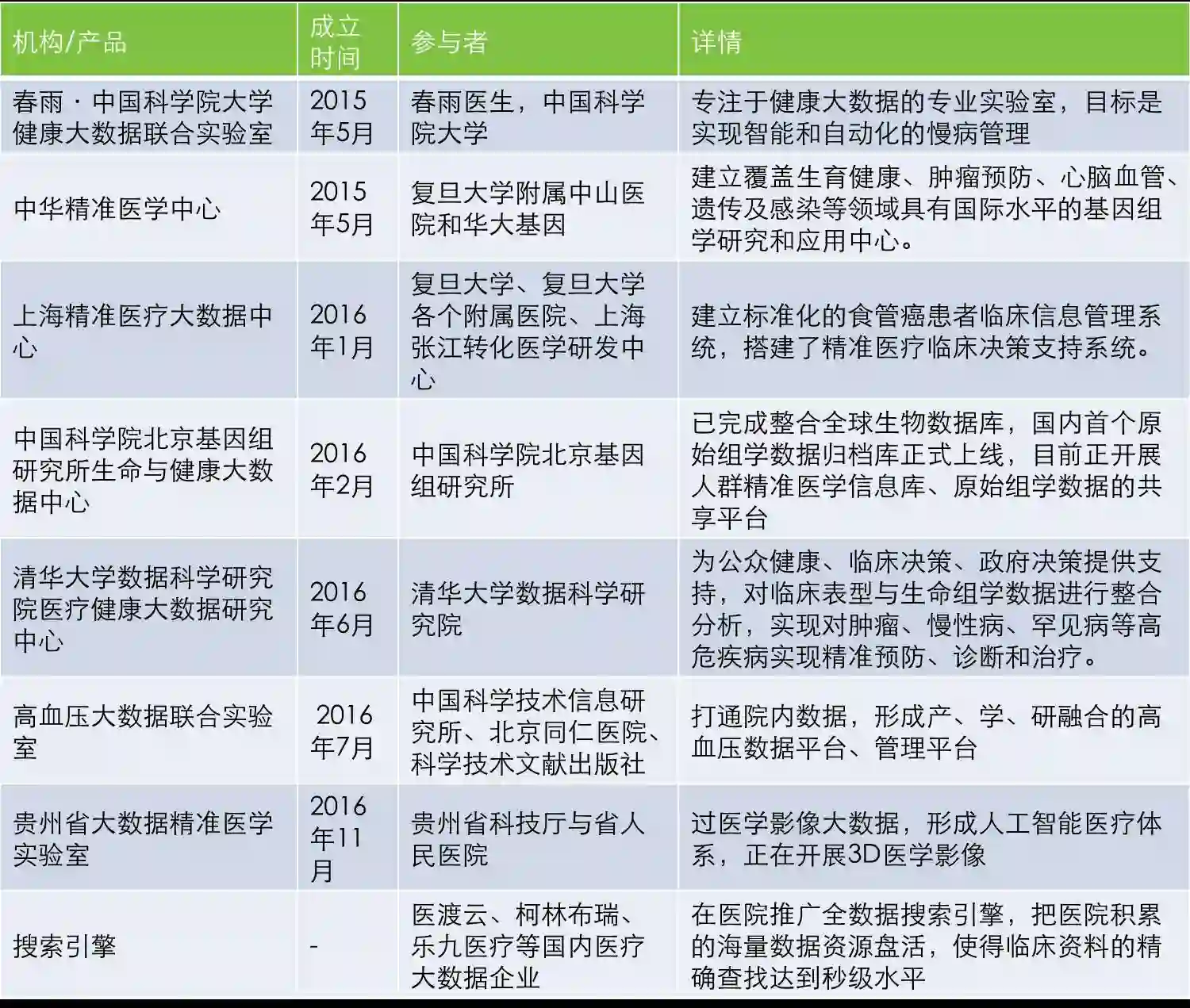 • 目前,科研院校、医院、互联网医疗企业、医疗信息化企业纷纷布局医疗大数据。