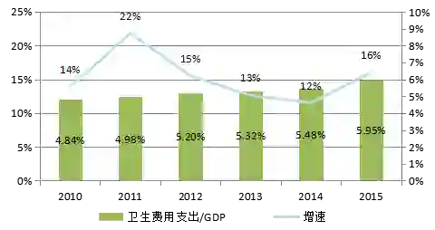 • 在经济增速放缓的大背景下,医疗领域逆势而上。2015年卫生支出已经接近4.1万亿,增速高达16%,占GDP的比重为5.95%,相较于2010年上升1.11个百分点。