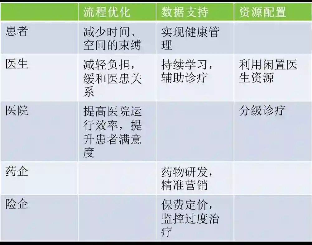 我们认为互联网的核心在于信息互联,因此互联网医疗的功能是由此带来的流程优化、数据支持和资源配置。