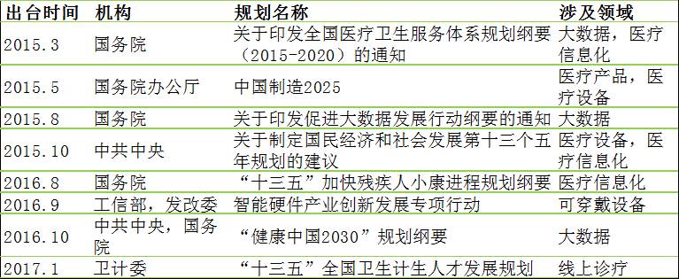 • 总体来看,互联网医疗相关政策对智能硬件、医疗信息化、大数据等持鼓励支持态度。