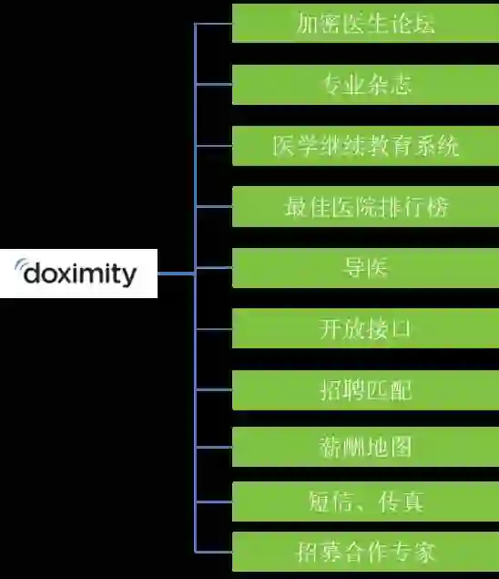 • Doximity被称作“医师们的LinkedIn”,是专注于医疗领域的垂直社交平台。从成立到2014年底,会员人数达到40万,相当于全美一半的医师数量,平均每人关联的同事超过50个,累计近21.5万个工作机会通过Doximity提供给其成员。