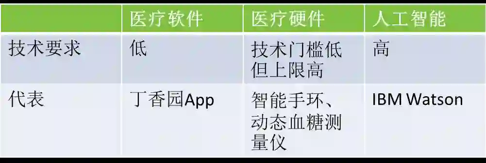 从技术角度,互联网医疗可以分为三类,一是软件应用,在线问诊、在线挂号、支持系统等皆属于此类;二是医疗硬件;三是人工智能领域的互联网医疗,以IBM Watson为代表。