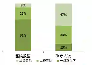 • 消费习惯上,患者更偏爱高等级医院而非基层首诊,导致了三级医院的虹吸效应,三级医院以8%的数量占比负担着47%的诊疗人次。