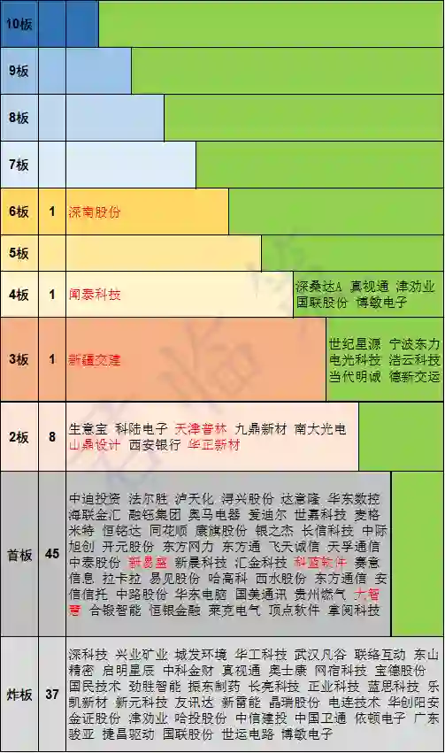 图中标的剔除新股和ST,绿色背景为炸板或进阶失败个股,其他颜色背景为对应高度涨停个股。红色字体为主观选择的对应高度核心股,每个高度不超过三只,便于观察市场情绪变化和结构走向,非投资建议。