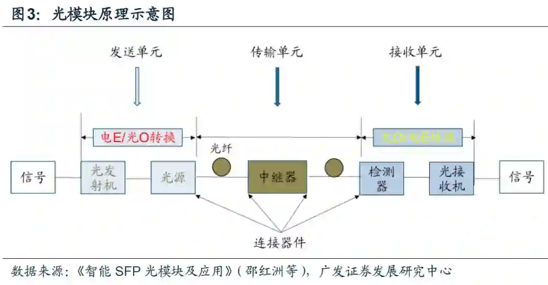 光模块是光通信系统中重要部件,负责在信息发送端把电信号转换成光信号,通过光纤传送后,接收端再把光信号转换成电信号,通过过电-光和光-电的转换,实现信息的高速互联。