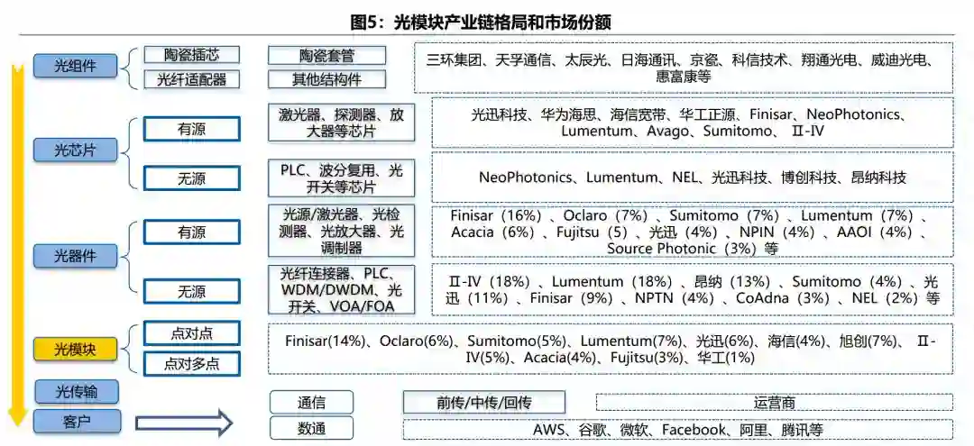 光模块的产业链主要为光芯片-> 光器件 -> 光模块 -> 设备,其中光模块环节位于产业链末端,其上游是光芯片,占光模块成本的50%以上;下游是通信设备商,最终产品应用到数据中心和电信市场。越往下游竞争力越强,光芯片目前是行业瓶颈。