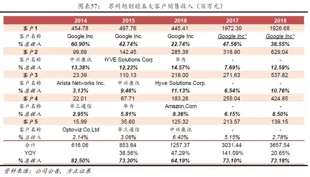 苏州旭创的客户主要是国内外数据中心及通信行业的知名企业及配套供应商,与 Google、华为、亚马逊、中兴的全球顶尖互联网/设备商建立了长期供货关系。