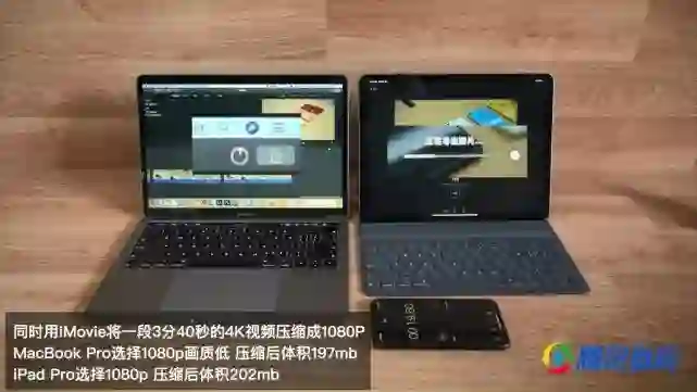 通过我的实际测试,同样使用iMovie软件,将一段三分半钟的4K视频压缩成1080P视频输出。新的iPad Pro速度居然比MacBook Pro还要快。当然,这个部分需要说明一下,虽然采用了同一段视频素材,也采用了同一个软件,但是压缩出的视频质量还是有差异。在体积大小对比中,用iPad Pro压缩出的视频体积大概在202mb左右,而MacBook Pro压缩出的视频体积大概在197mb左右。虽然不能完全做到精准的控制变量,但是对于用户来说,直观的感受就是同样一段素材,能够更快的获得成片。