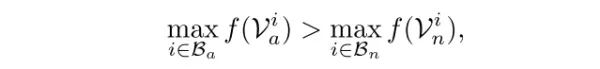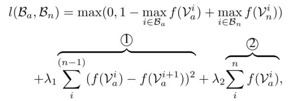 此处 Va 和 Vn 分别为异常和通常样本,f则为模型预测函数。由于在 MIL 中,并不知道正包中每个样本的真实标签,所以采用以下的形式: