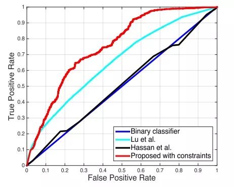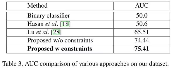 本文主要以 ROC 曲线下的 AUC 来衡量异常检测算法的效果,其实验结果如下图和下表所示。可以看出,其算法比起之前的方法还是有很大的提高的。此外,添加训练中的约束项也带来了一定的效果提升,不过不是很明显。