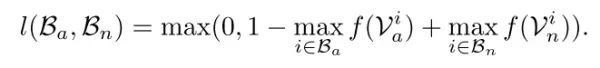 此处即指,在训练中对于正包和负包都只使用分数最大的样本来训练。具体而言,正包中分数最大的样本最可能是正样本,而负包中分数最大的样本则被认为是 hard negative,即难例。基于此式,为了让正负样本之间的距离尽可能远,作者采用了 hinge-loss 的形式。