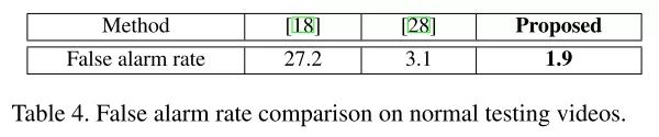 在监控任务场景中,一个可靠的系统应该具备较高的召回率和较低的误报率,作者比较了0.5阈值下的误报率,也具备不错的效果。
