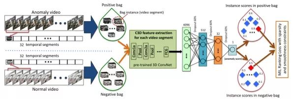 基于这样的想法,该文采用了多示例学习(Multiple instance learning, MIL)方法来构建算法框架,并提出了包含 稀疏和平滑约束的 MIL 排序损失来训练模型。算法框架如下图所示,主要使用 MIL 的思路构建训练集合,使用 C3D+FC 的网络来获取异常评分,最后采用提出的 MIL 排序损失来训练模型。