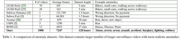 本文的另外一个贡献是提出了一个新的较大规模的异常事件检测数据集 UCF-Crime,参考下表,该数据集比起之前的数据集的优点主要是两方面:一是视频的数量和视频的总时长要远远多于之前的数据集,二是其中包含的异常事件类型比较丰富。