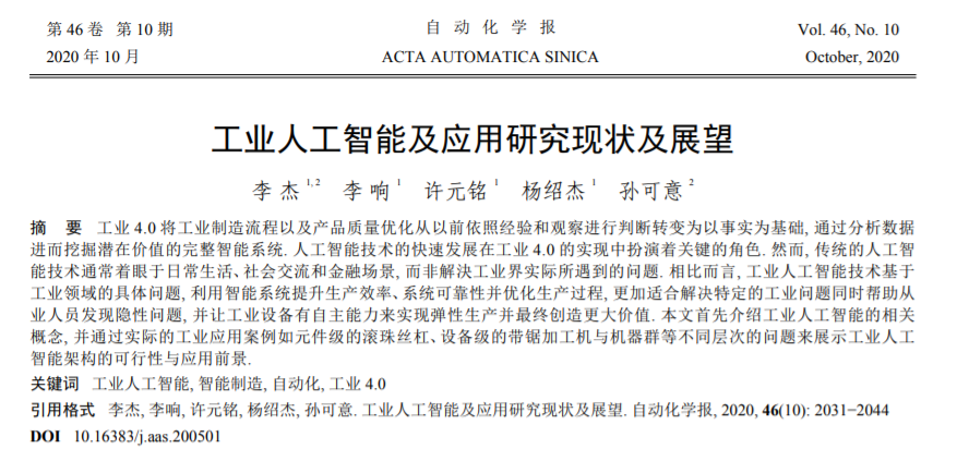摘要: 工业4.0将工业制造流程以及产品质量优化从以前依照经验和观察进行判断转变为以事实为基础, 通过分析数据进而挖掘潜在价值的完整智能系统. 人工智能技术的快速发展在工业4.0的实现中扮演着关键的角色. 然而, 传统的人工智能技术通常着眼于日常生活、社会交流和金融场景, 而非解決工业界实际所遇到的问题. 相比而言, 工业人工智能技术基于工业领域的具体问题, 利用智能系统提升生产效率、系统可靠性并优化生产过程, 更加适合解决特定的工业问题同时帮助从业人员发现隐性问题, 并让工业设备有自主能力来实现弹性生产并最终创造更大价值. 本文首先介绍工业人工智能的相关概念, 并通过实际的工业应用案例如元件级的滚珠丝杠、设备级的带锯加工机与机器群等不同层次的问题来展示工业人工智能架构的可行性与应用前景.