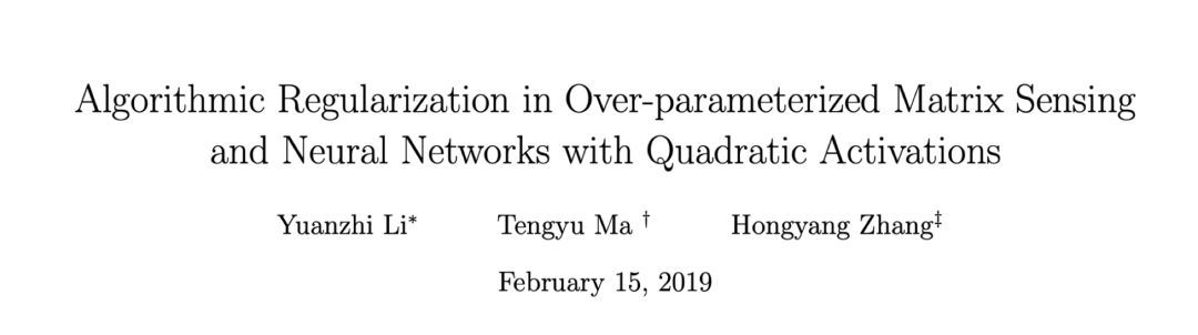 2018年,马腾宇与Yuanzhi Li 、Hongyang Zhang三人合作的论文《Algorithmic Regularization in Over-parameterized Matrix Sensing and Neural Networks with Quadratic Activations》发表在COLT上,并获得了最佳论文奖。而这篇论文与NIPS‘16的最佳学生论文类似,从开始做到投稿,前后仍然只用两个月的时间。在这篇主题为“正则化”的工作中,马腾宇他们直接follow了之前的一篇工作,但那先前的工作只能解决一个特殊问题,而马腾宇意识到如果沿着他们的思路做,可能会变得越来越复杂。意识到这一点本身非常重要。他说: