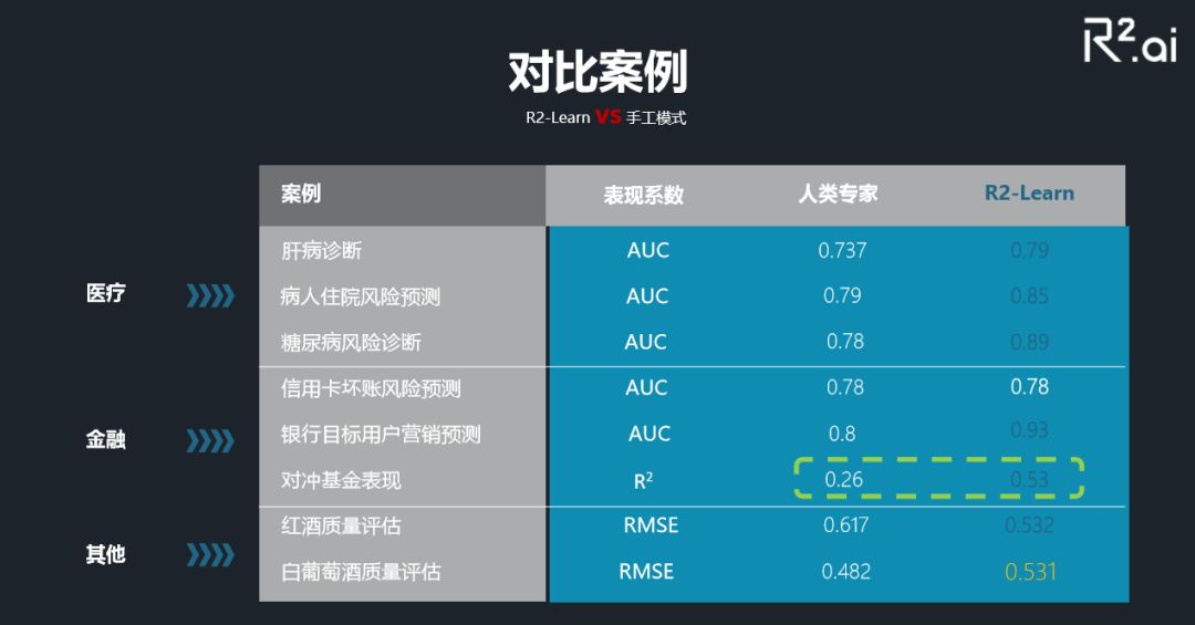 为此,人工智能公司 R2.ai, Inc 发布的自动化机器学习建模 R2 Learn 解决方案(www.r2ai.com.cn/pricing)通过算法集成、步骤引导,将整个建模过程交由机器处理,完全实现了建模过程的自动化、规范化和可视化,全程帮助企业创建模型。同时,通过算法与特征工程相匹配的流程化调参建模方式,解决了人工编程往往无法解决的高维数据处理与模型搭建。为了保证建模质量,经过多个行业的测试和反复打磨,自动化机器学习建模方式在大部分的测试中表现都由于传统建模方式。