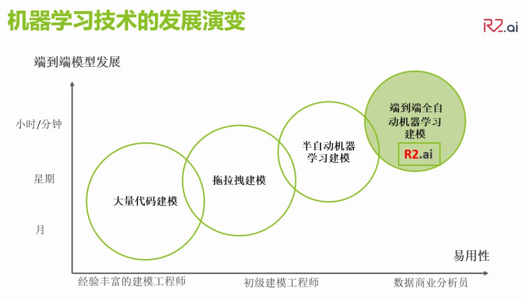 在数据量及数据维度呈几何级数增长的大数据时代,传统的建模方式,无论是模型算法的选择还是建模系统的架构都已经逐渐无法应对处理这些巨型数据的需求。为了使得机器学习变得非常容易、快捷、同时保证高质,其技术演变经历了一个复杂的过程。早期,开发人员的建模方式仍需大量的代码书写,在此之后的建模方式进化到所谓拖拉拽式的建模,再到近期的半自动建模(让机器学习做大部分建模流程),最后逐步转变为现在的全程自动机器学习建模。而全程自动机器学习的建模方式,其终极目标就是让初级建模工程师,甚至不具备工程师背景的数据商务分析人员,都能轻松建立精准的大数据预测和分析模型。