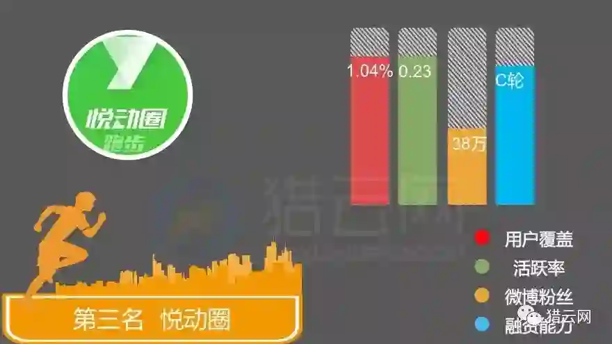 猎云君:排名第一的Keep在用户覆盖率、新浪微博指数、百度移动搜索指数、融资能力方面都处于霸主地位。尽管Keep用户覆盖率最高,但用户活跃率却是悦动圈居首。