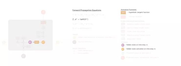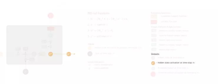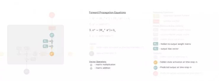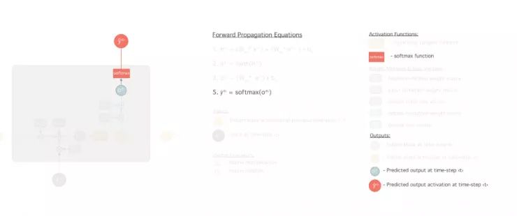 第六步:最后,通过将 o⟨t⟩ 传输给激活函数(例如 sigmoid 或 softmax),得到了一个实际输出的标准化概率向量 ŷ⟨t⟩。输出的激活函数的选择通常取决于期望的输出类型(sigmoid 用于二元输出,softmax 用于多类别输出)。