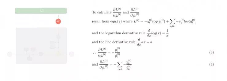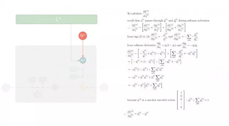 第二步:接下来我们开始往后计算损失函数 L⟨t⟩ 对预测输出值的激活值 ŷ⟨t⟩ 的偏导数值。因为在前向传播过程中 softmax 函数以多分类的输出值作为输入,因此下面的偏导数值