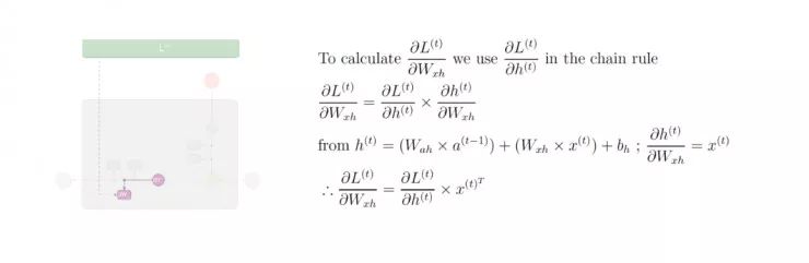 及链式法则,计算出损失函数 L⟨t⟩ 对输入层至隐层中的偏置矩阵 W_xh 的偏导数值:
