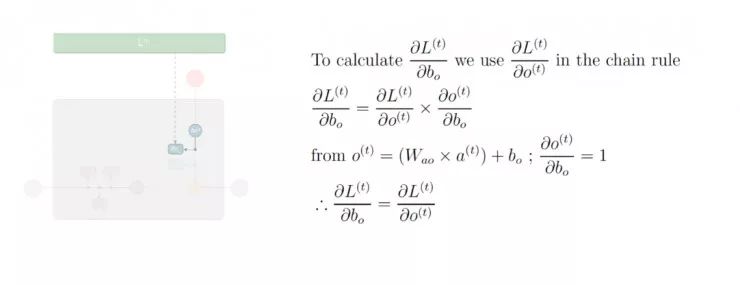 及链式法则,计算出损失函数 L⟨t⟩ 对输出过程中的偏置向量 b_o 的偏导数值: