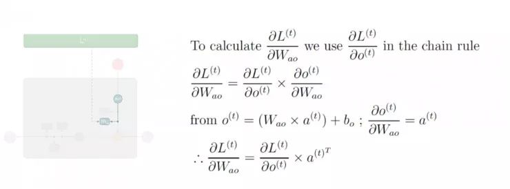 及链式法则,计算出损失函数 L⟨t⟩ 对隐层至输出层中的权值矩阵 W_ao 的偏导数值:
