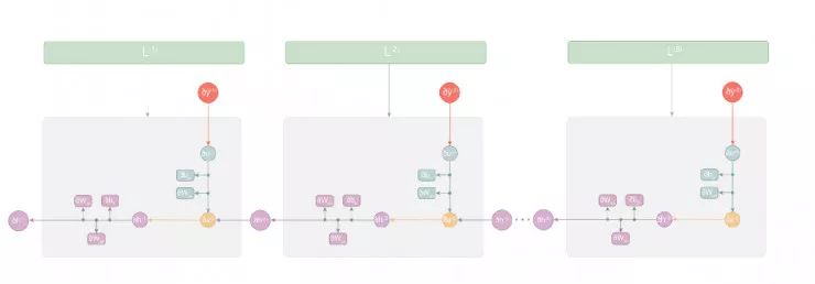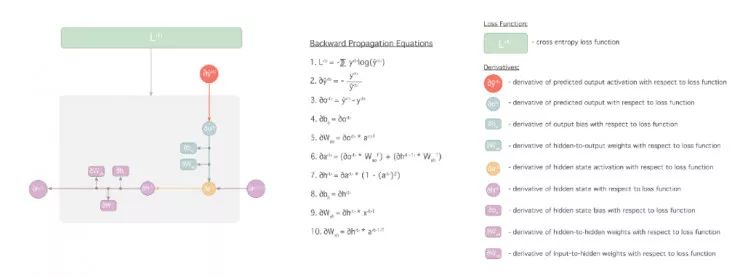 主要的区别在于我们必须将每个时间步 t 的偏导数值累加起来,从而更新权值和偏置,这是因为这些参数在前向传播的过程中是被各个时间步所共享的。