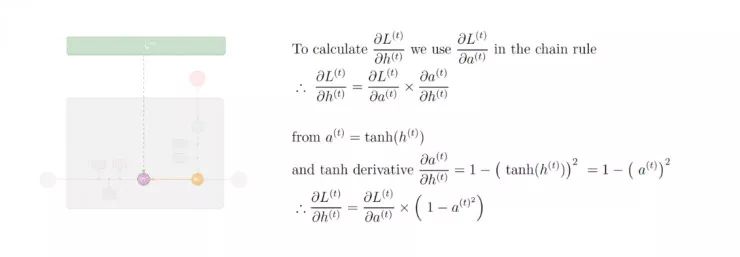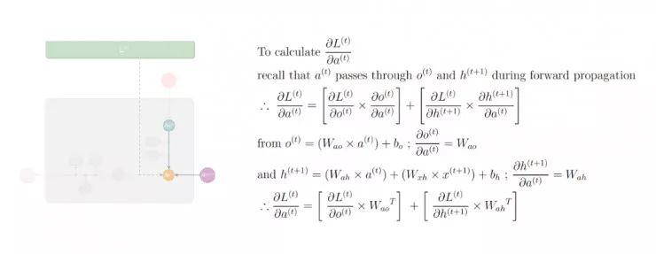 及链式法则,计算出损失函数 L⟨t⟩ 对隐状态的激活值 a⟨t⟩ 的偏导数值: