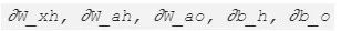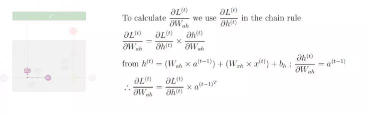 及链式法则,计算出损失函数 L⟨t⟩ 对输入层至隐层中的偏置矩阵 W_ah 的偏导数值: