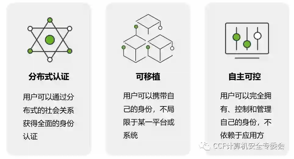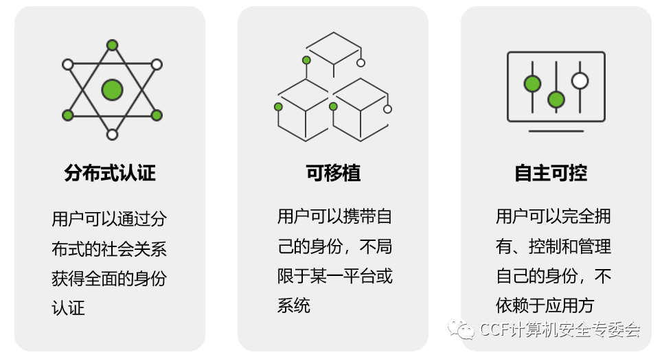 分布式公钥基础设施(DPKI)作为PKI的演进,并非是对PKI的全盘抛弃和替代,更多是在原有认证体系基础之上的一种改进和补充,通过构建一种分布式的认证体系来解决中心化认证体系存在的问题,是未来网络信任生态的基础设施。DPKI与PKI在业务流程上并无明显区别,首先用户提供相关信息并发起申请,接下来发证方审核信息,颁发证书,最后用户出示证书完成验证。但不同于PKI体系,DPKI强调用户身份的自主可控、身份可移植和分布式认证,个人身份的验证不再依赖于发证方,DPKI认证体系的具体特性如下图所示。