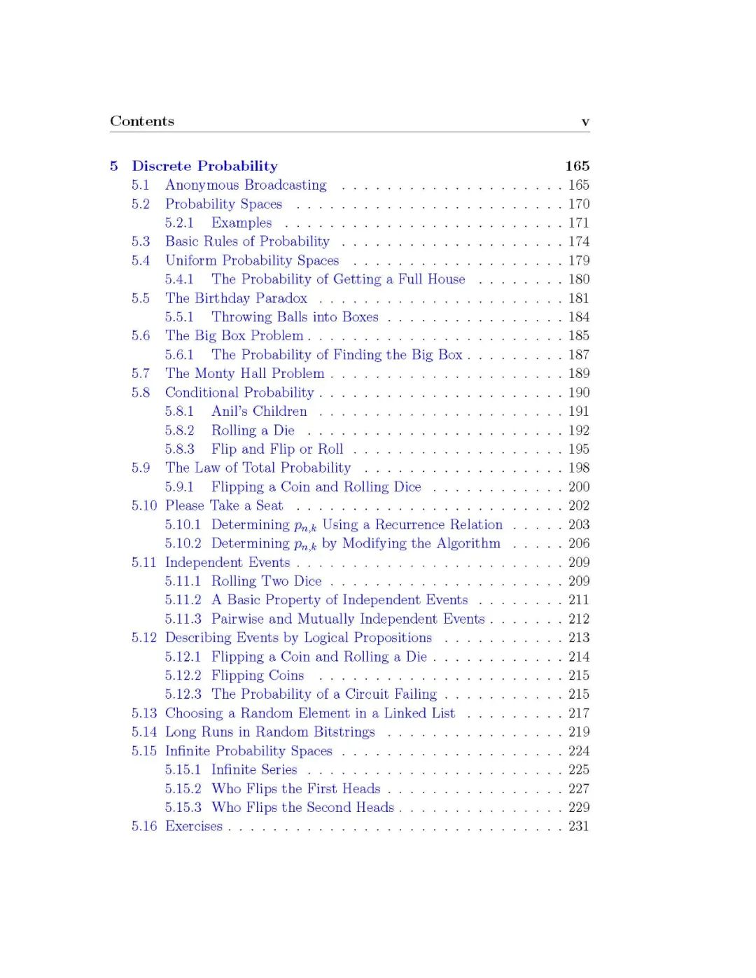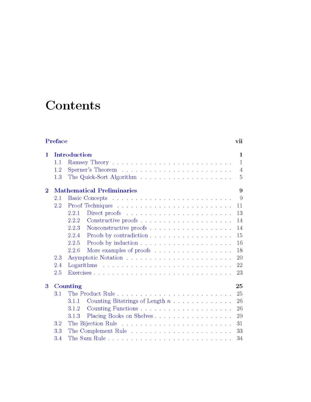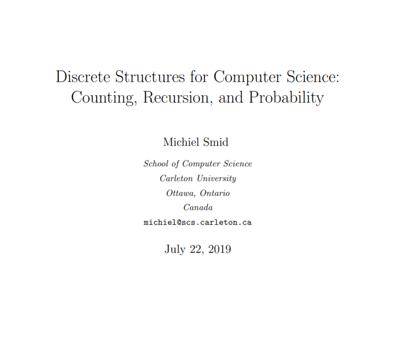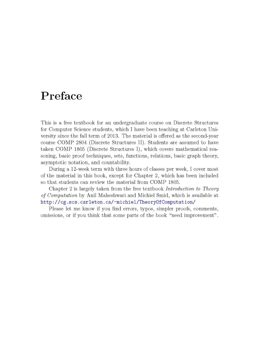 这是一本免费的面向计算机科学学生的离散结构本科课程教材,我从2013年秋季学期开始在卡尔顿大学教授。本课程为二年级课程COMP 2804(离散结构II)。学生必须修过COMP 1805(离散结构I),涵盖了数学推理、基本证明技巧、集合、函数、关系、基本图论、渐近符号和可数性。在一个12周的学期中,每周有3个小时的课,我涵盖了这本书的大部分材料,除了第二章,它已经包含在里面了,以便学生可以复习COMP 1805的材料。