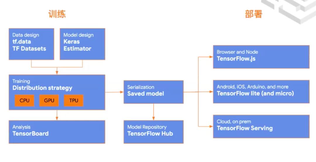 TensorFlow 2的目标是「让机器学习更简单」,在易用性上做了很多的尝试,它的架构如下所示: