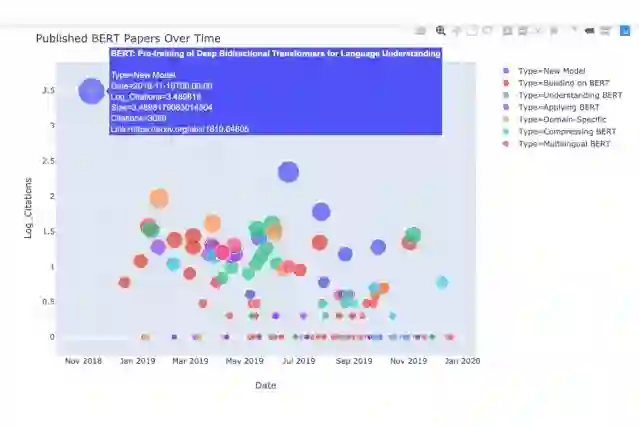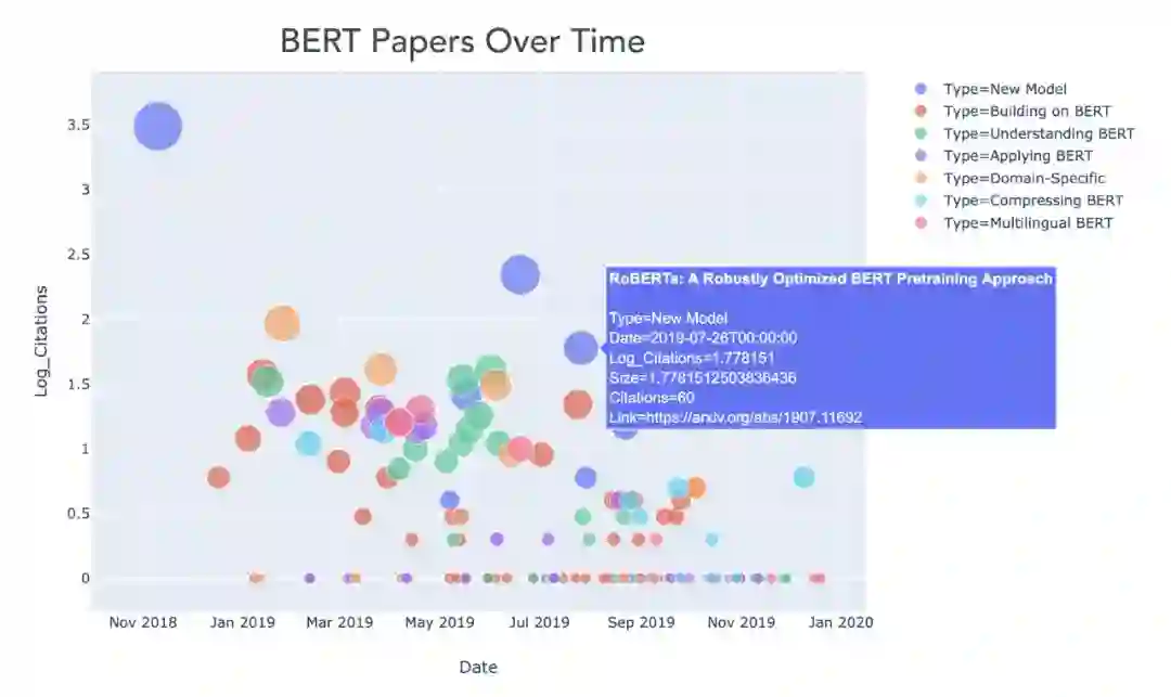 2018年11月至2019年12月期间发表的BERT相关论文。y轴是paper引用的log(由谷歌Scholar得到),这些论文中的大部分是通过在arXiv论文的标题中搜索BERT找到的。