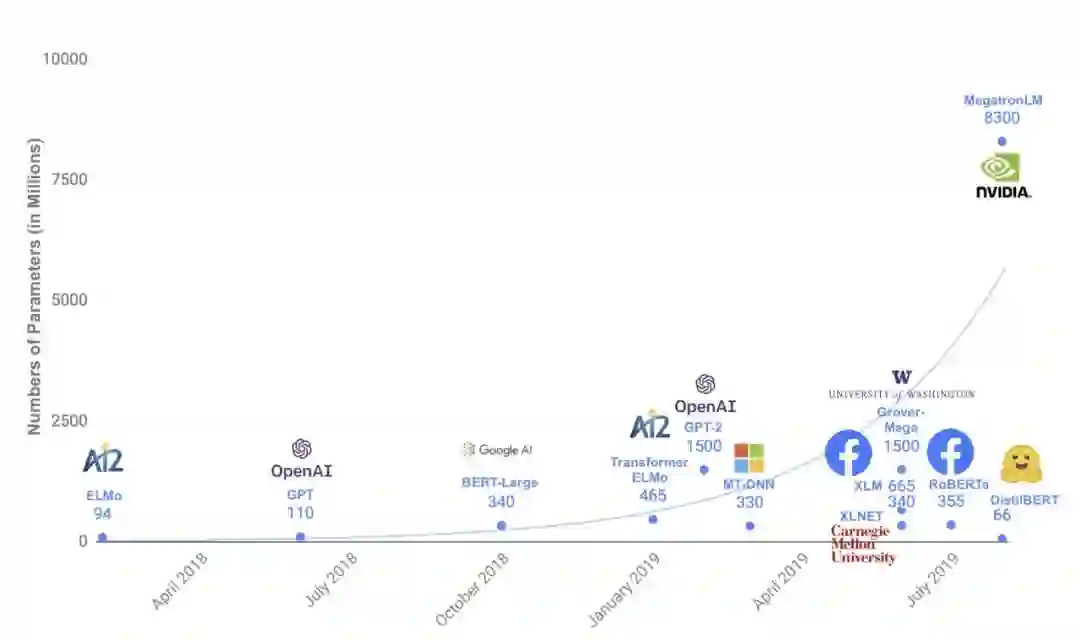 关于模型大小的思考。BERT论文的作者发现,简单地增加模型的大小就可以显著地提高性能,即使是在非常小的数据集上。也许这意味着在某种意义上,您“需要”数亿个参数来表示人类语言。2019年的其他几篇论文发现,简单地扩大NLP模型的规模就会带来改进(著名的OpenAI的GPT-2模型)。还有一些新的技巧来训练大得离谱的NLP模型,比如NVIDIA的80亿个参数巨兽。但也有证据表明,随着模型尺寸的增大,收益会递减,这与计算机视觉研究人员在增加卷积层时遇到的困难类似。
