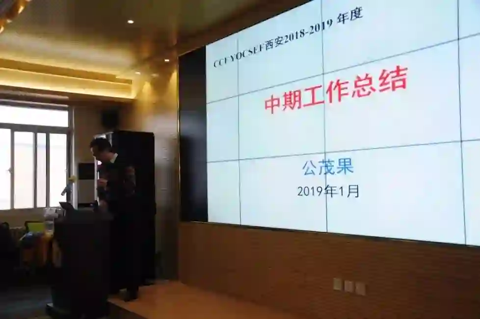 会议第二项议程:2018-2019 YOCSEF西安主席公茂果作2018-2019中期工作总结,汇报了YOCSEF西安向与会人员汇报了过去一年CCF YOCSEF西安所举办的一系列活动以及所取得的进步与成就。