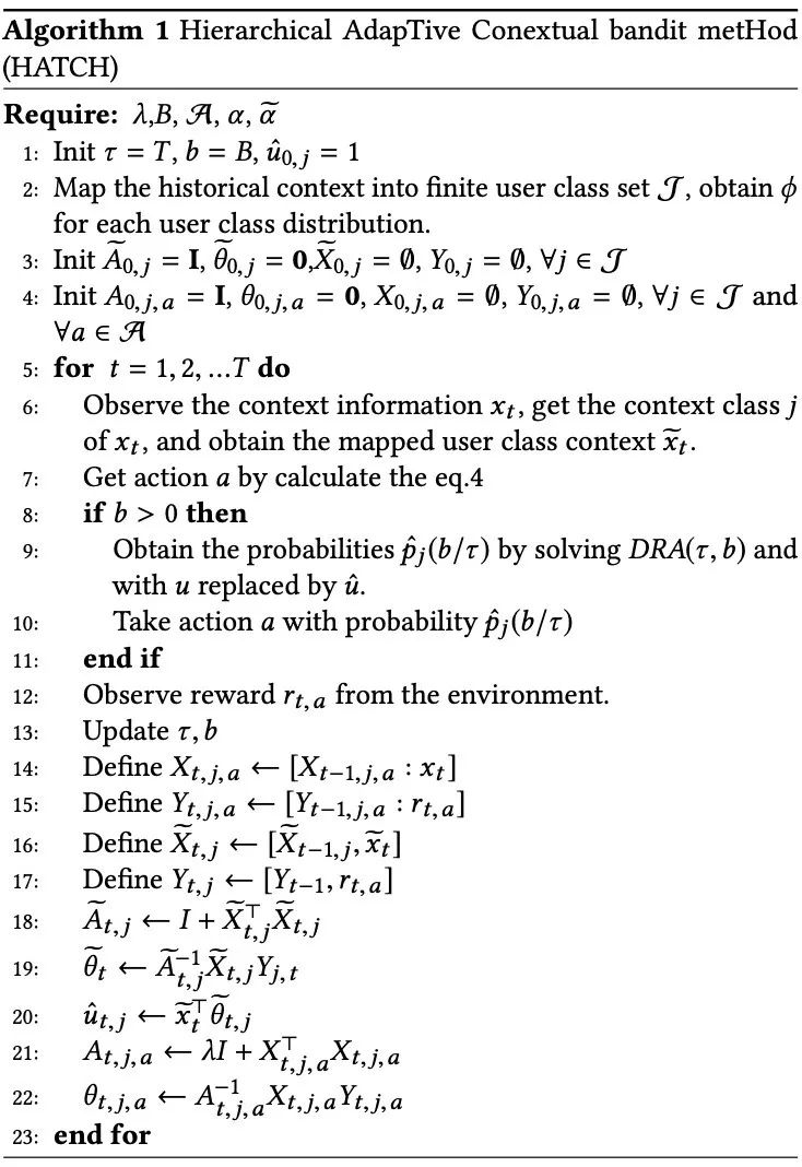 在这篇文章中,滴滴 AI Labs 提出了一种基于强化学习的层次自适应的多臂老虎机的资源限制下的个性化推荐方法 ( HATCH )。该方法将资源限制下的用户推荐问题建模成一个资源限制下的上下文老虎机问题,并使用层次结构同时达到资源分配策略和个性化推荐策略同时优化的目的。