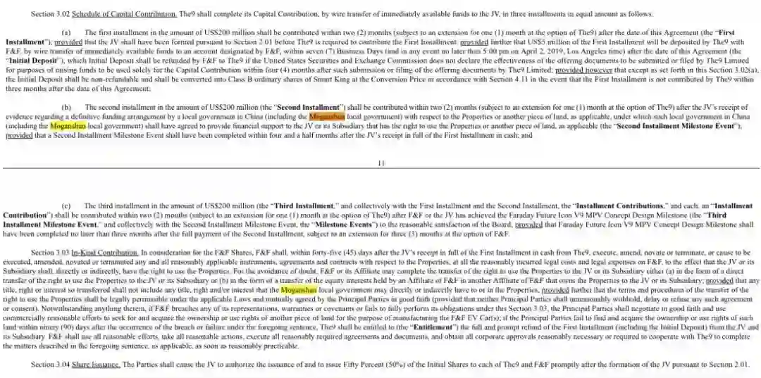 在投资协议中,九城向FF投资的6亿美元将分为三期支付,每期2亿美元。第一期的2亿美元在签订协议的2个月内支付,双方在香港成立合资公司。九城的二期支付条件为:双方合资公司要获得地方政府(包括莫干山地方政府)的资助,即提供土地以及资金。拿到地方政府许诺的2个月内,九城将继续支付2亿美元。