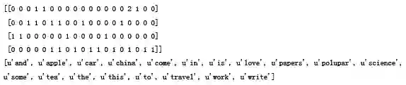 在词袋模型进行词频统计后,就可以用词向量表示这个文本。这里举一个直接用scikit-learn的CountVectorizer类来完成的例子,这个类可以完成文本的词频统计与向量化,代码如下: