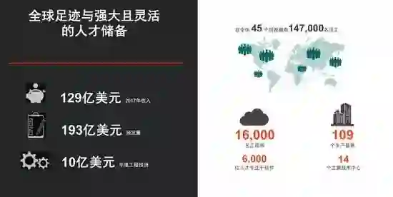 据安波福公司亚太区总裁、连接器系统全球副总裁/亚太区总裁杨晓明介绍,2017 年安波福实现了 129 亿美元的收入,获得订单金额 193 亿美元。目前,安波福在全球范围内用于 16000 名工程师,单 2017 年工程研发投资总额就超过 10 亿美元。