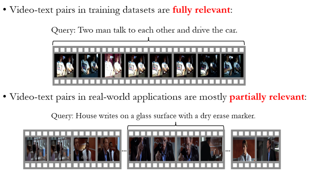 相比之下,PRVR 任务更加符合实际应用场景,且更具有挑战性。作者将 PRVR 任务视为一个多示例学习的问题,将视频同时视为由多个片段以及视频帧所组成的包。若文本与长视频的某帧或者某个片段相关,则视为文本与该长视频相关。