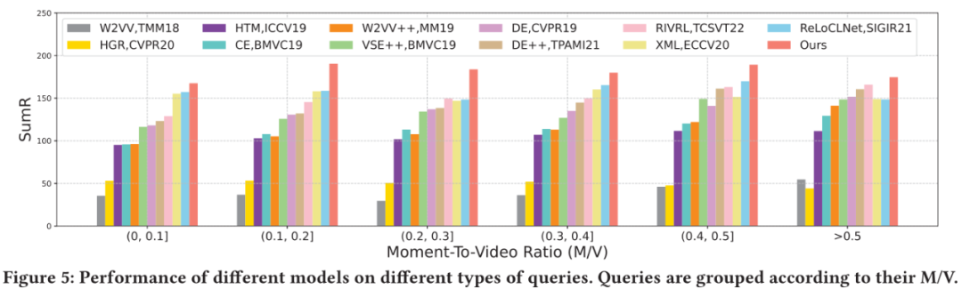 由于在上述的性能对比实验中仅反映了模型检索数据集中所有文本-视频对的整体性能,为了在更加细粒度的方面探索各模型对不同相关性的文本-视频对的检索性能,作者定义了片段时长/视频时长比(M/V)这一概念,它以通过查询文本所对应的正确片段持续时间除以整个视频的持续时间来衡量。M/V 越小,表示对应视频与查询文本相关的内容越少,反之则越多。此外, M/V 越小,查询文本与其对应视频的相关性越低,而 M/V 越大,相关性越高。根据 M/V 的大小,作者将 TVR 数据集上的 10895 个测试查询文本分为六组,并报告了在不同分组上的性能。