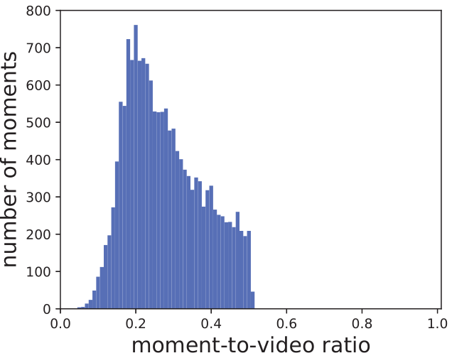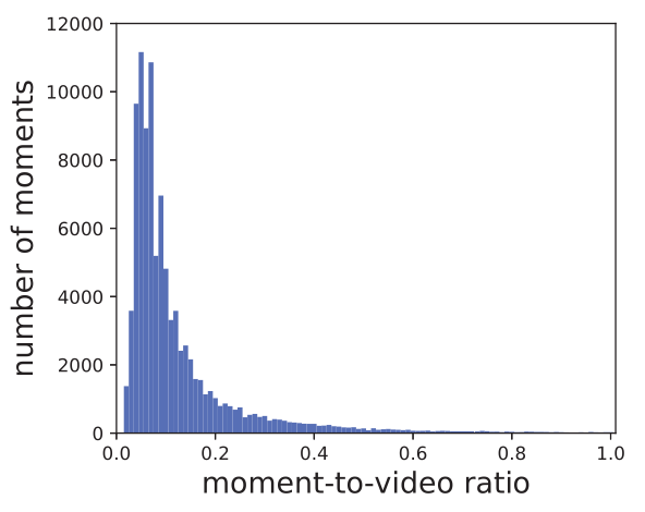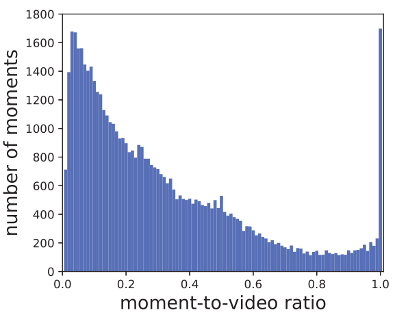 虽然 PRVR 任务和传统的 T2VR 任务的目标均为从视频库中检索出查询文本的对应视频,但在 PRVR 任务中视频通常比较长,同时文本查询对应的片段在原视频中的时长占比分布较广。如图 3 所示,在 TVR 和 Charades-STA 数据集中,时长占比大多分布在 50% 以下;Activitynet 数据集的占比则在 1%-100% 之间均有分布。