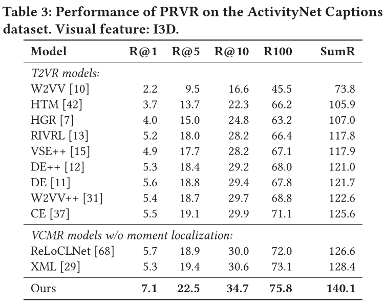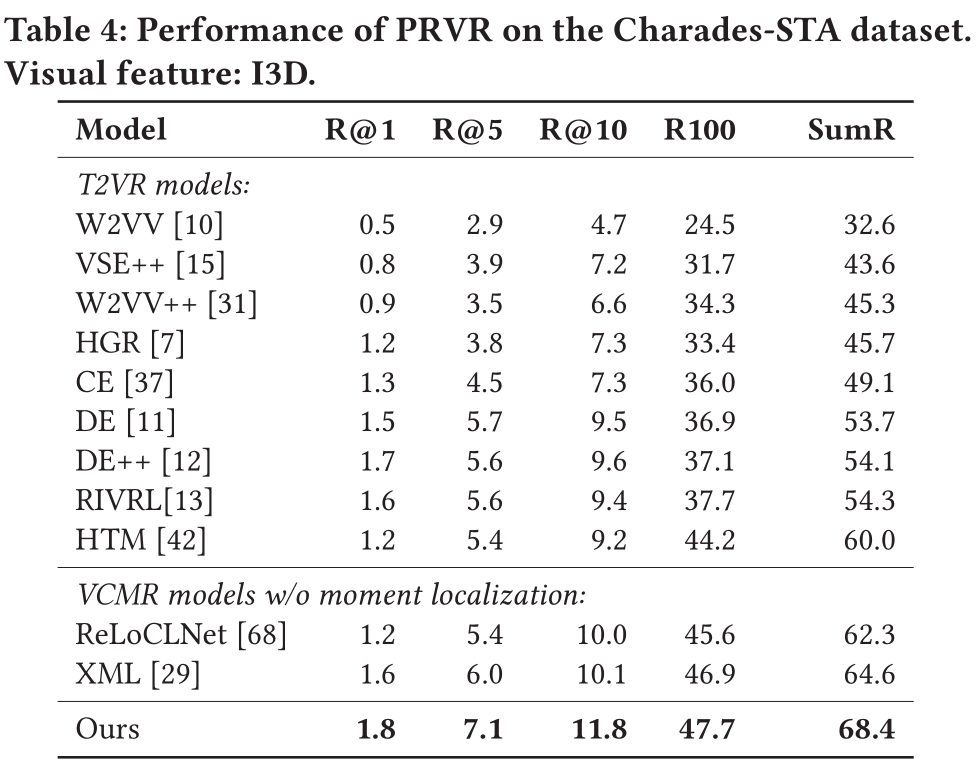 由于在上文提到,T2VR 任务的传统数据集并不适用与 PRVR 任务,所以作者使用了被用于单视频定位任务(Single Video Moment Retrieval, SVMR)和视频库定位任务(Video Corpus Moment Retrieval, VCMR)的数据集,分别是 TV show Retrieval、Activitynet Captions 以及 Charades-STA。在以上三个数据集中,文本仅与视频中的某一片段相关,且视频的相对持续时间更长,符合 PRVR 任务的检索要求。此外,作者采用 R@1、R@5、R@10、R@100 以及 Recall Sum 等性能指标来衡量模型。同时,由于当前并没有模型是面向 PRVR 任务的,作者选取了在传统 T2VR 任务上表现较好的模型作为 baseline 并在以上三个数据集上进行重新训练,以此进行性能对比。