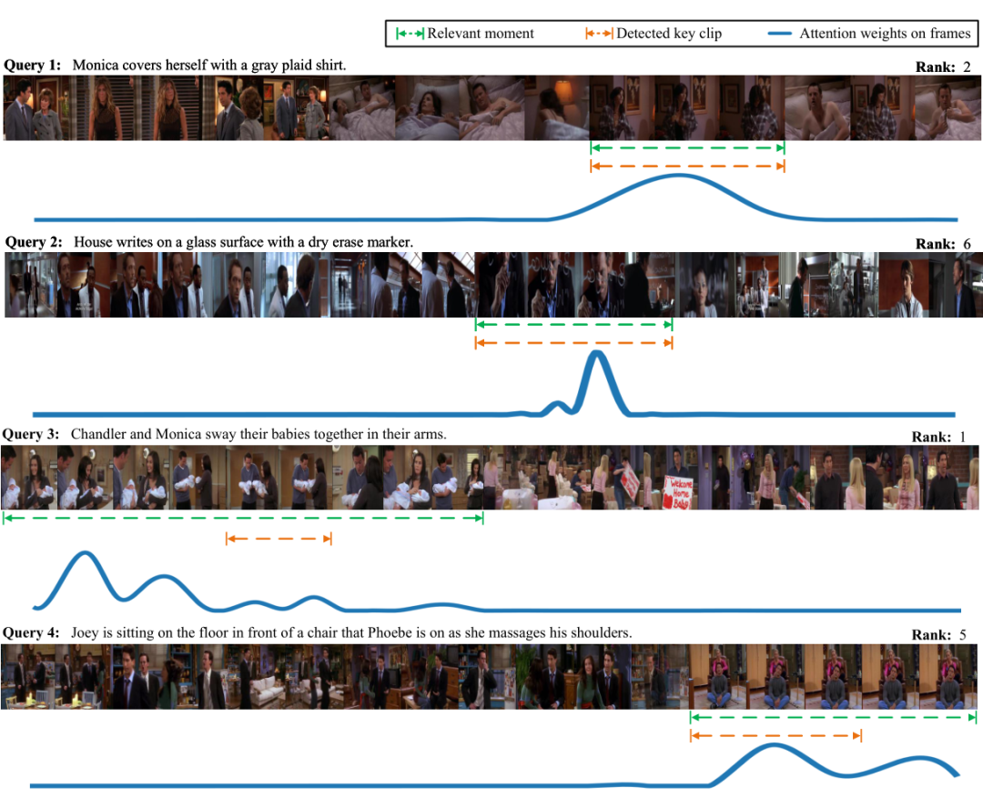 基于此,作者设计了多尺度多示例模型,该模型分别对视频进行片段尺度和帧尺度的特征表示,并引入了以关键片段为向导的注意力聚合方法,模型整体以从粗到细的方式学习文本-视频间的相似度关系。该模型除了在 PRVR 任务上表现较好之外,也可用于提高视频库片段检索(Video Corpus Moment Retrieval,VCMR)模型的性能。